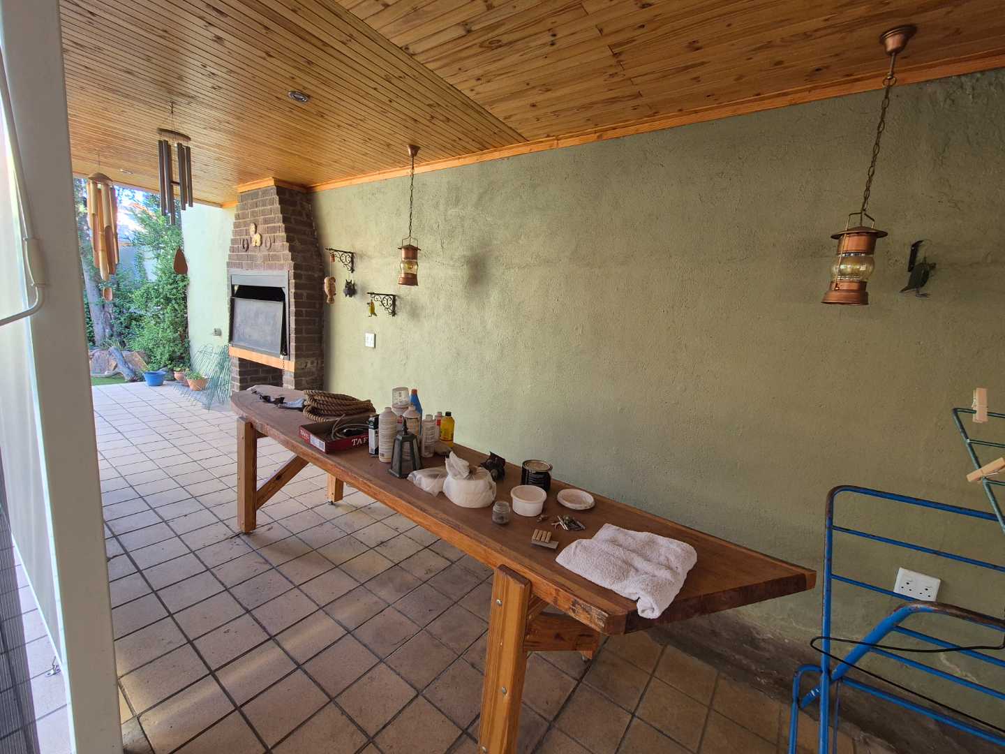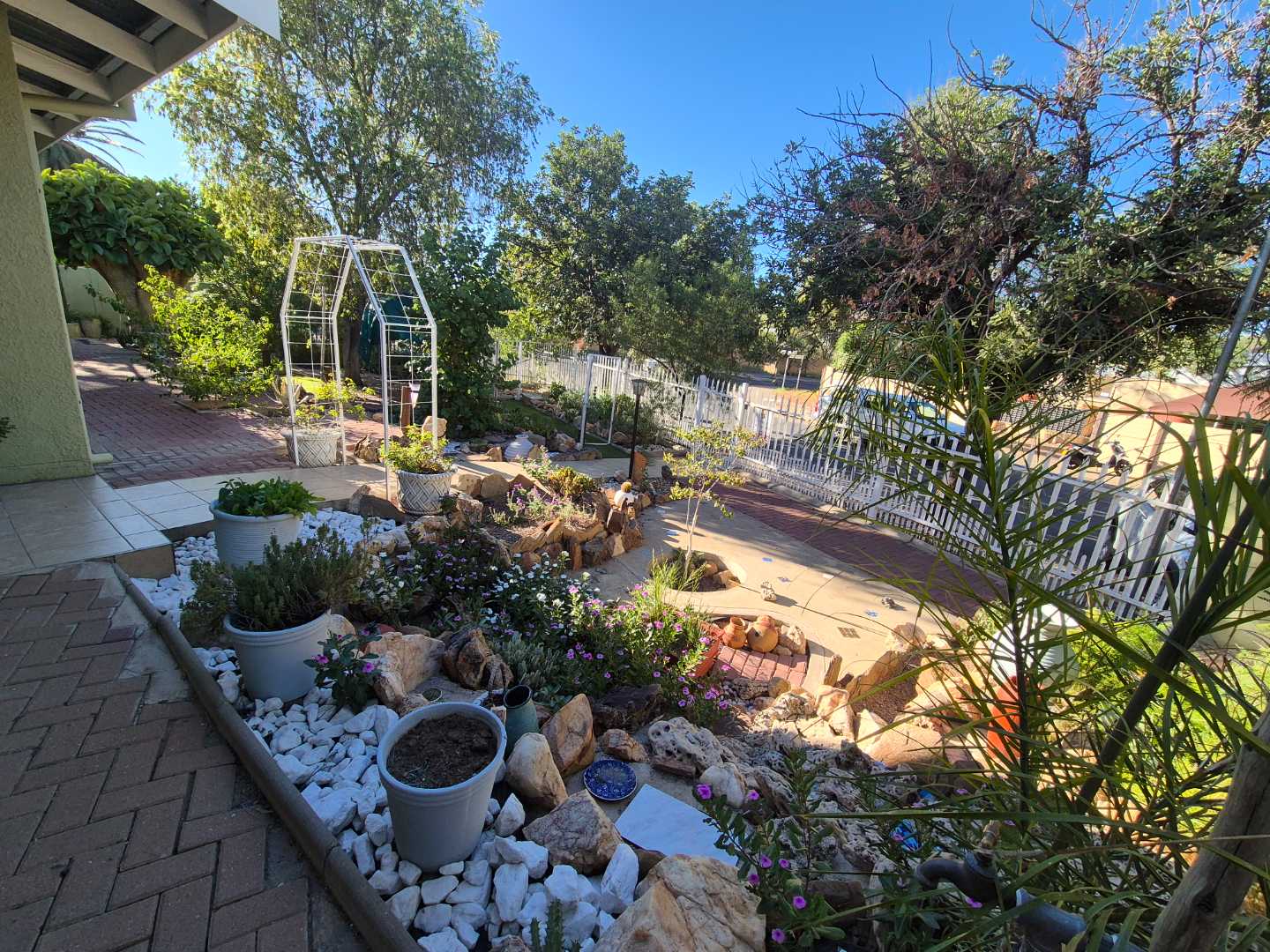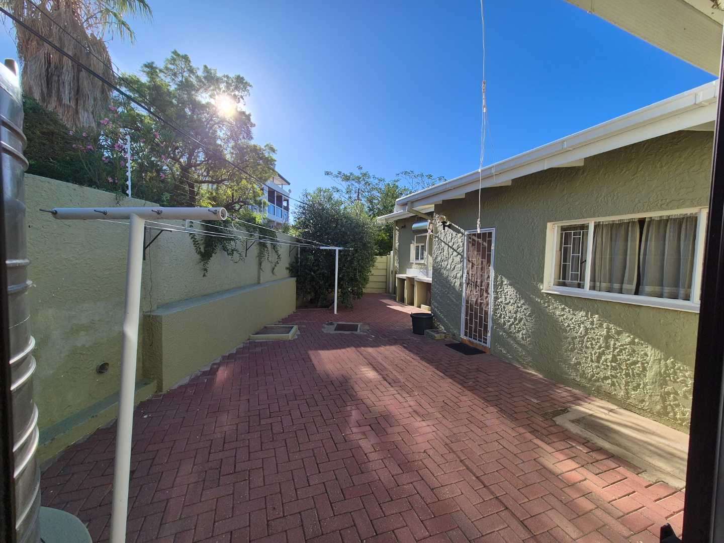 The main house has a open plan living area which connects to the living room, dining room and entertainment area. All on one level with two bathrooms of which the main is en-suite. Kitchen comes with a scullery. Next to the living area is a store room or library connecting to a office. The office has its own entrance. Outside features a pool, solar geysers, BBQ area, outside toilet, sauna, guest bedroom with own bathroom, outdoor shower and water tank to collect rain water.