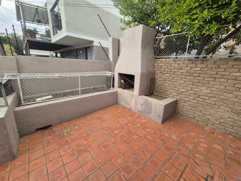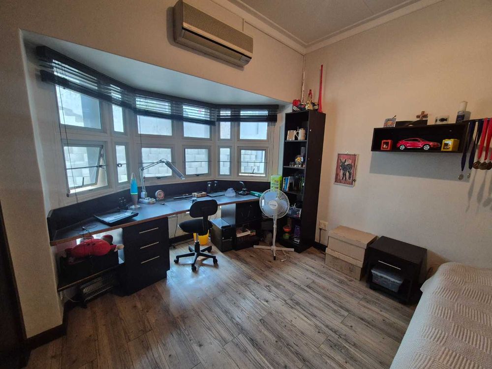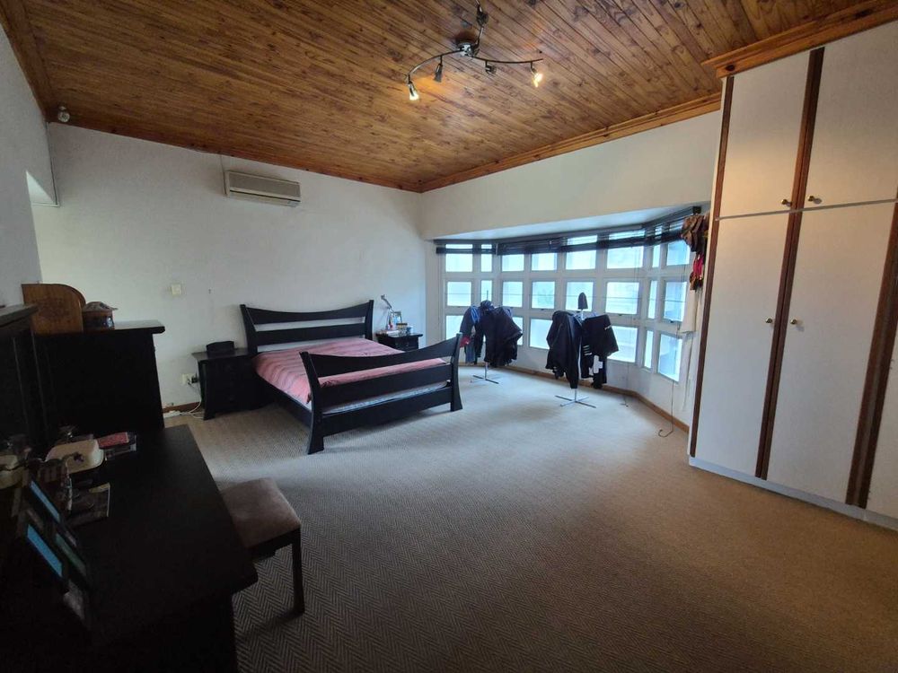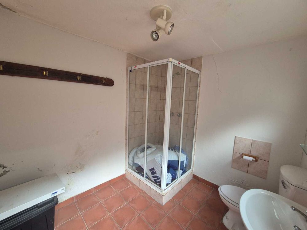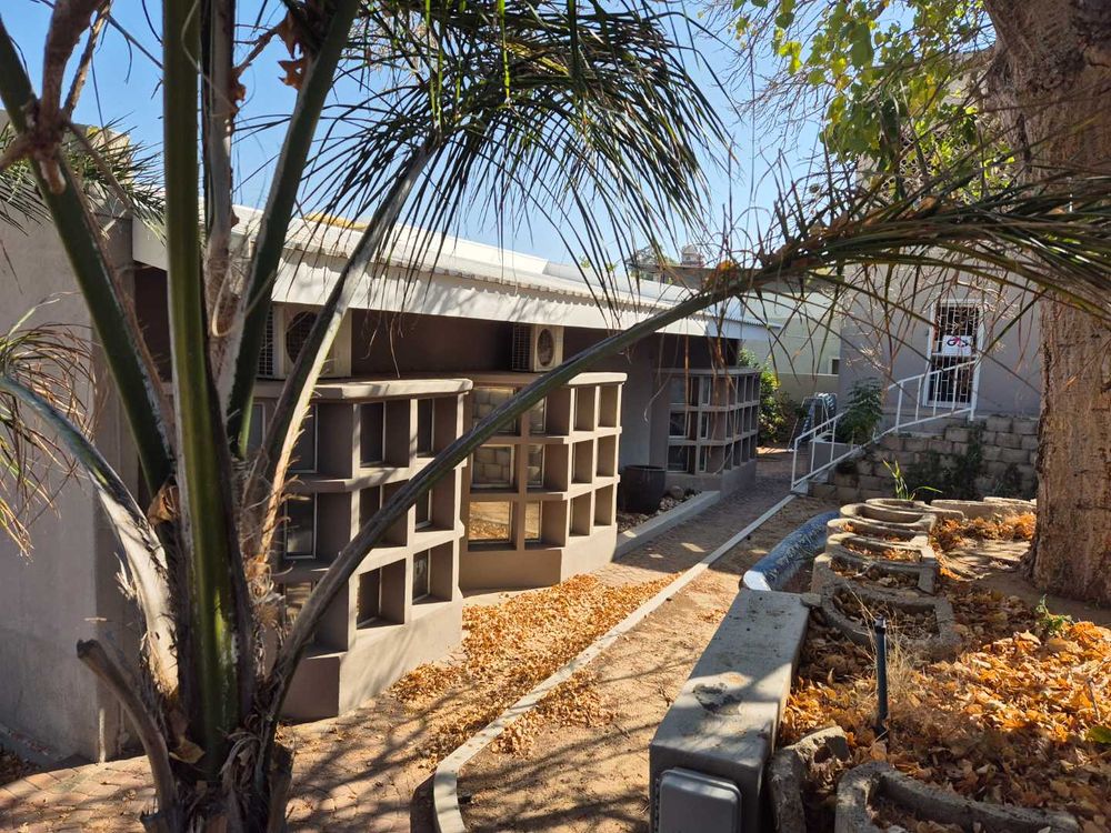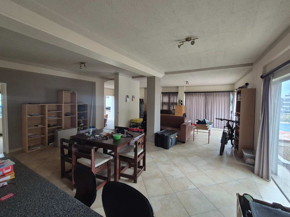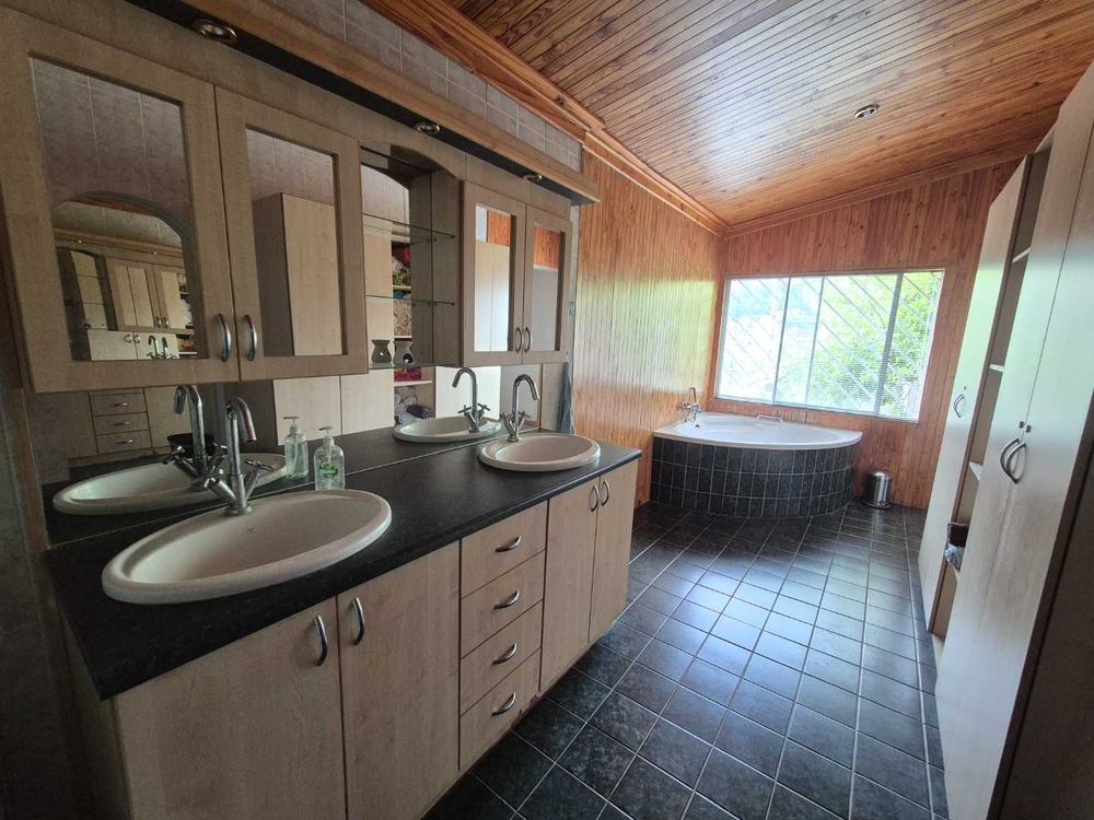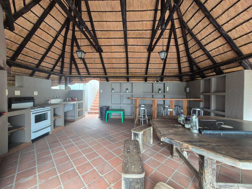 Three bedroom house and a two bedroom guest flat. It has an open plan dining and lounge area. A Fitted kitchen with a scullery and laundrey. The 2 bedroom flat is ons ground level. A double garage with a tandem. A Thatched BBQ area overlooks the swimming pool and also close to the cool room. A fish pond is close to the office and seperate from the house.