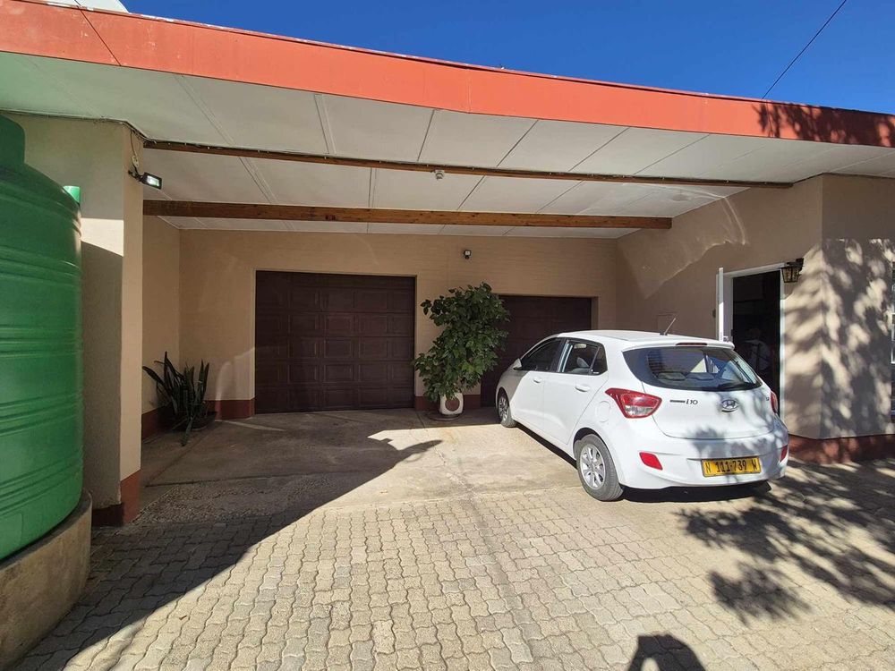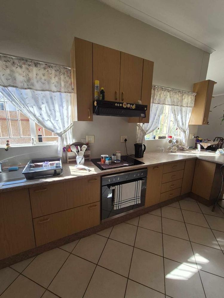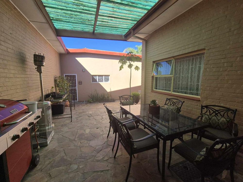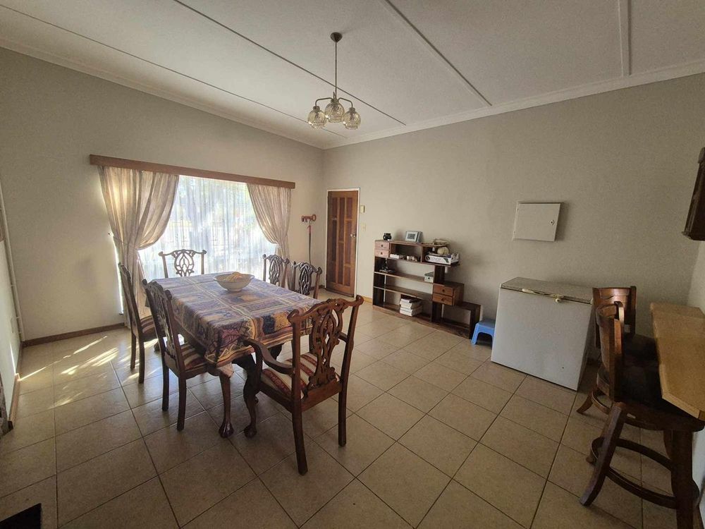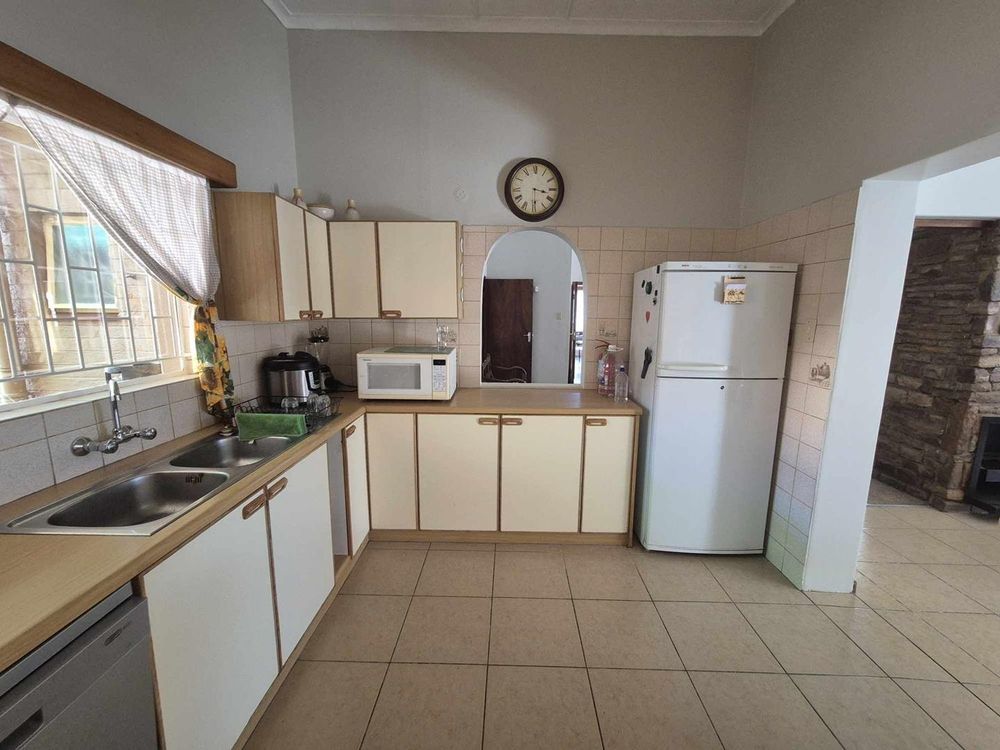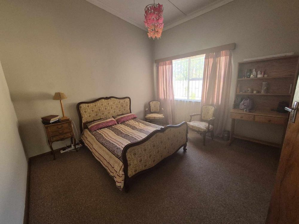 3 bedrooms, 2 bathrooms, kitchen with dining room and TV room with fire places. separate laundry and guest room/servants room. Two bedroom flat with kitchen and open plan living. Spacious erf with pool area and veranda