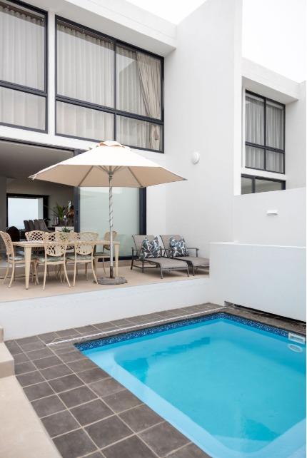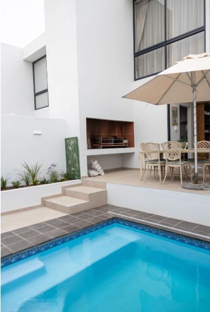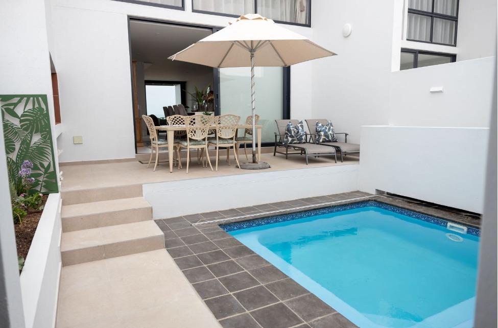 From the kitchen, step into a private backyard featuring a heated dipping pool, built-in braai and outdoor patio, ideal for entertaining or relaxing in privacy.