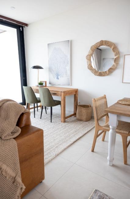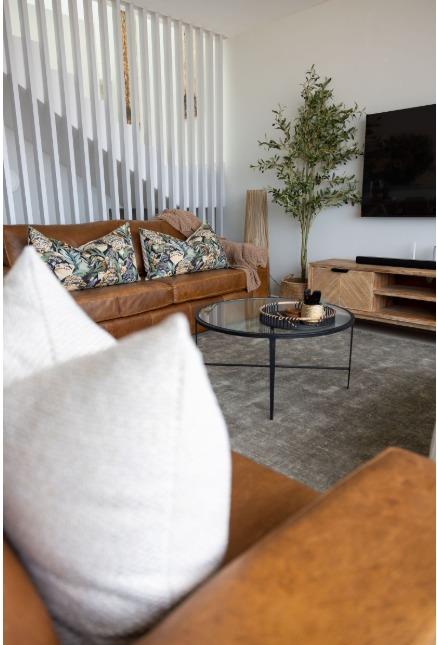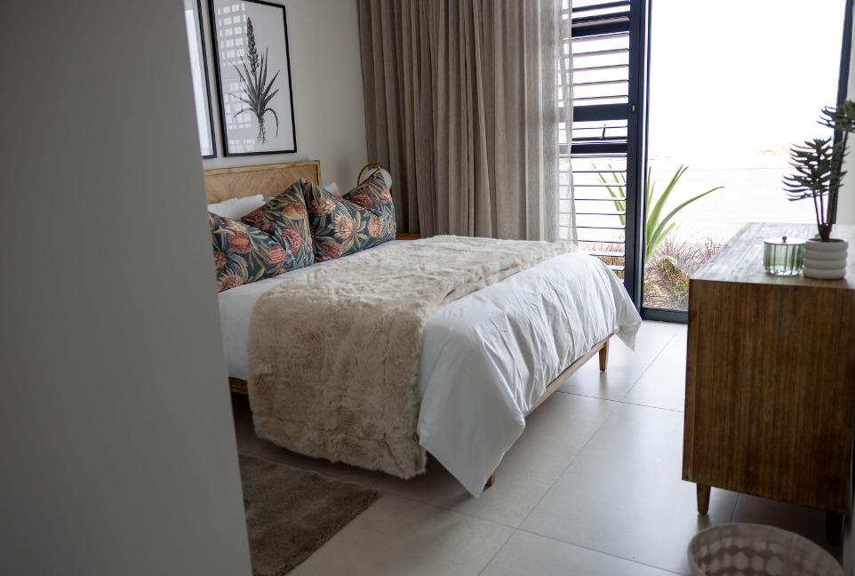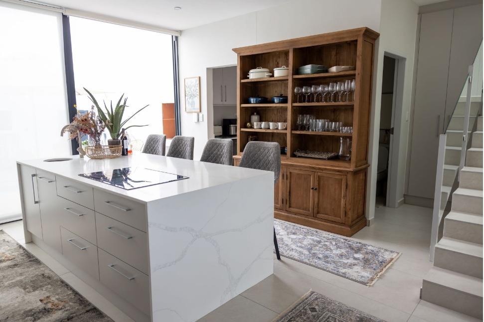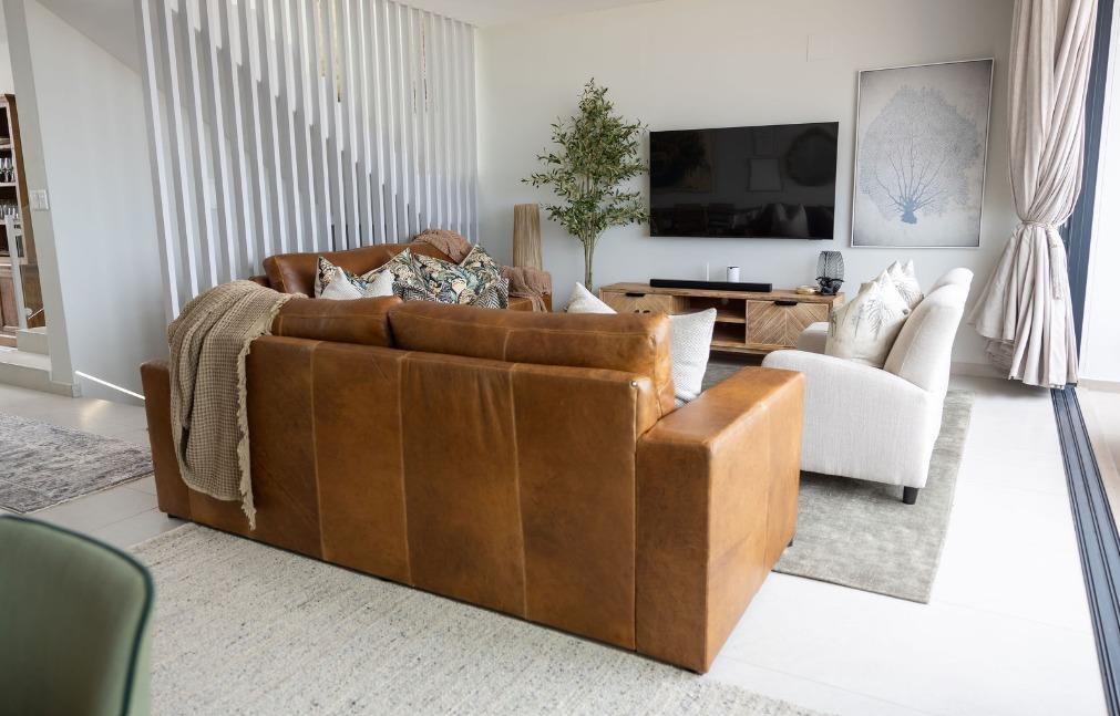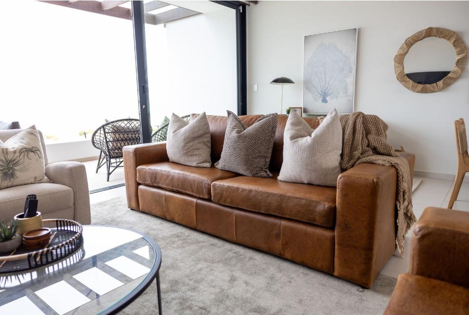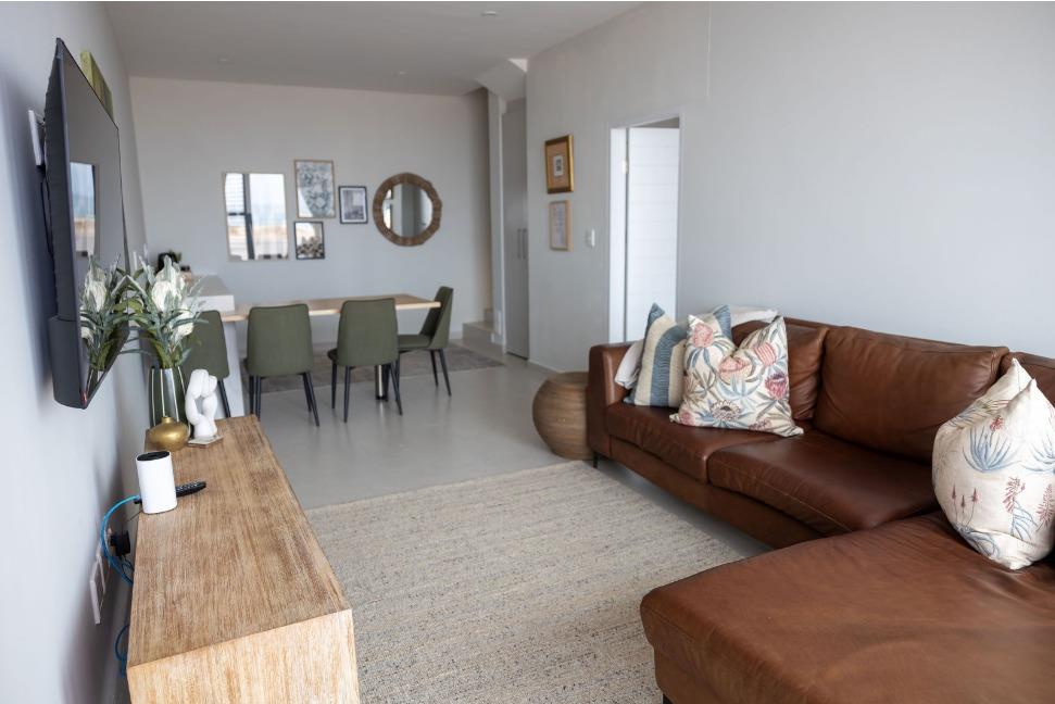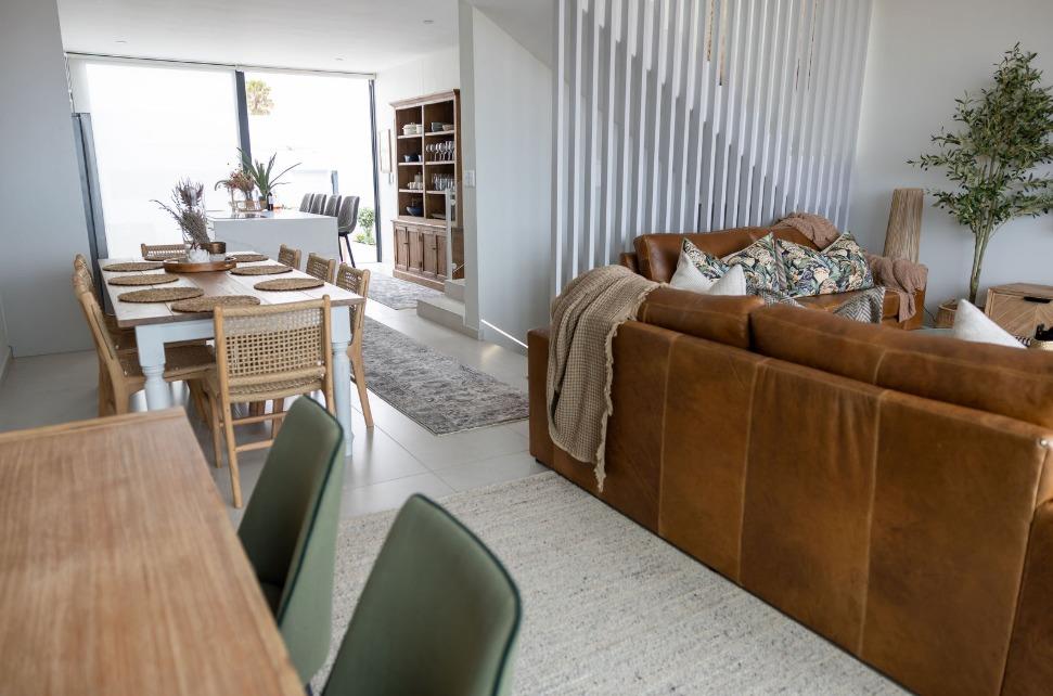The main living level boasts a stylish open-plan kitchen, dining area and lounge, fully furnished with high-quality appliances, smart interior features, leather couches, elegant curtains, original artwork and air-conditioning throughout. Large glass doors open seamlessly onto the patio, creating the perfect setting for sunset views and sundowners.