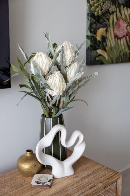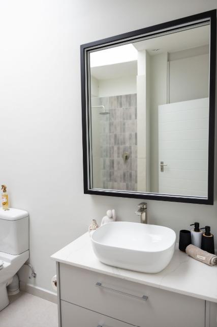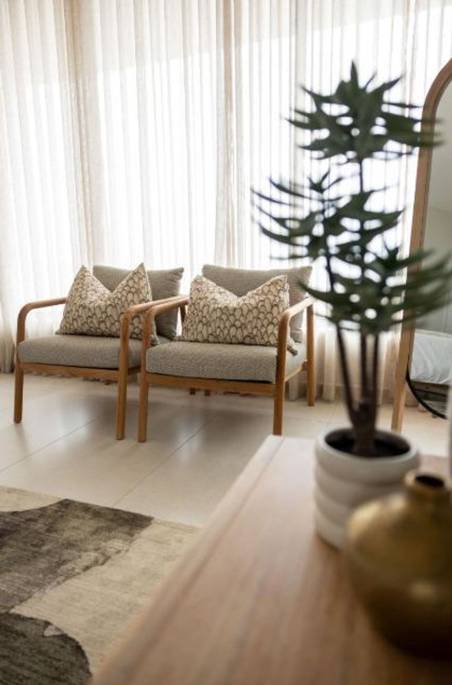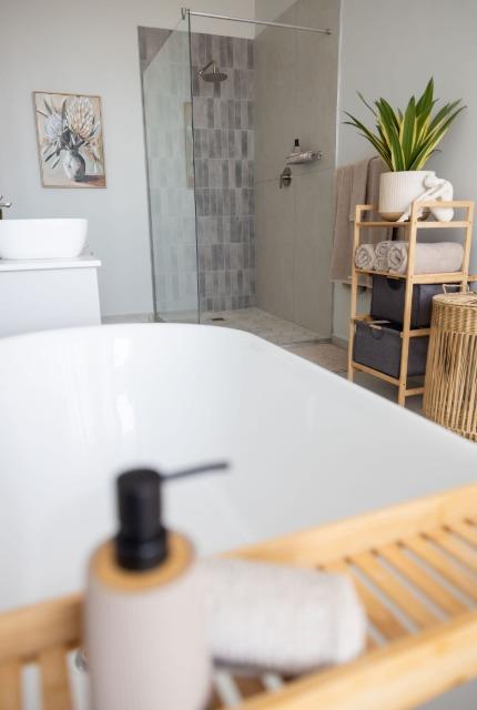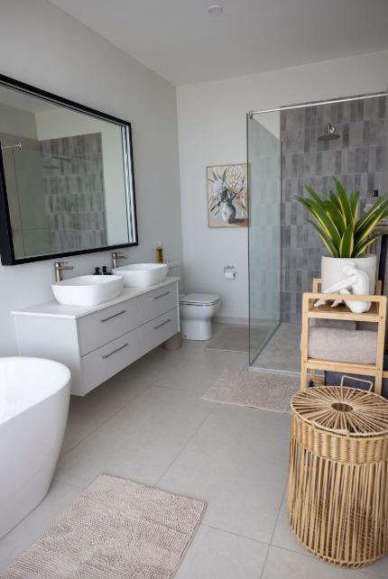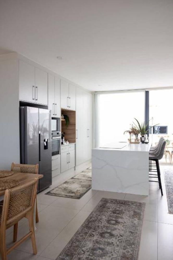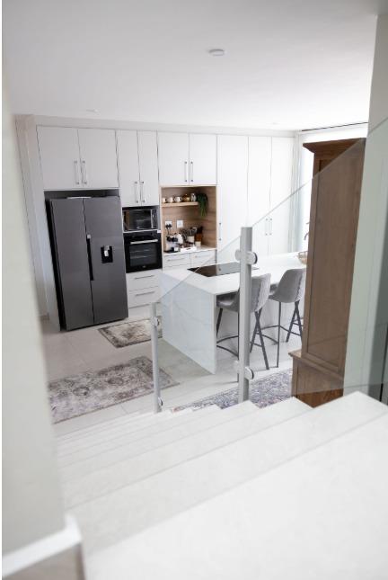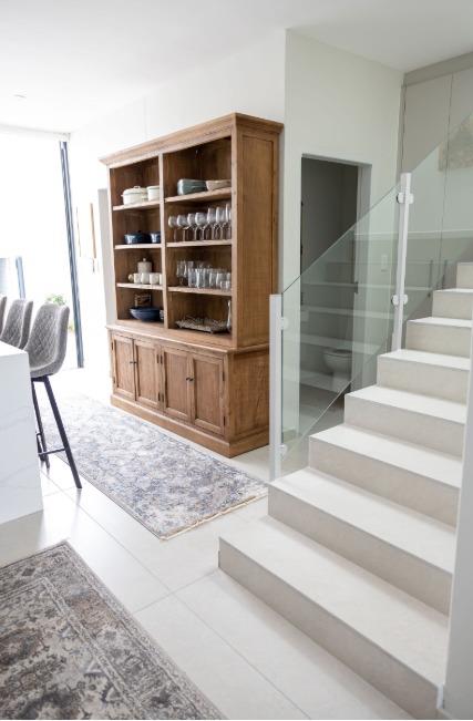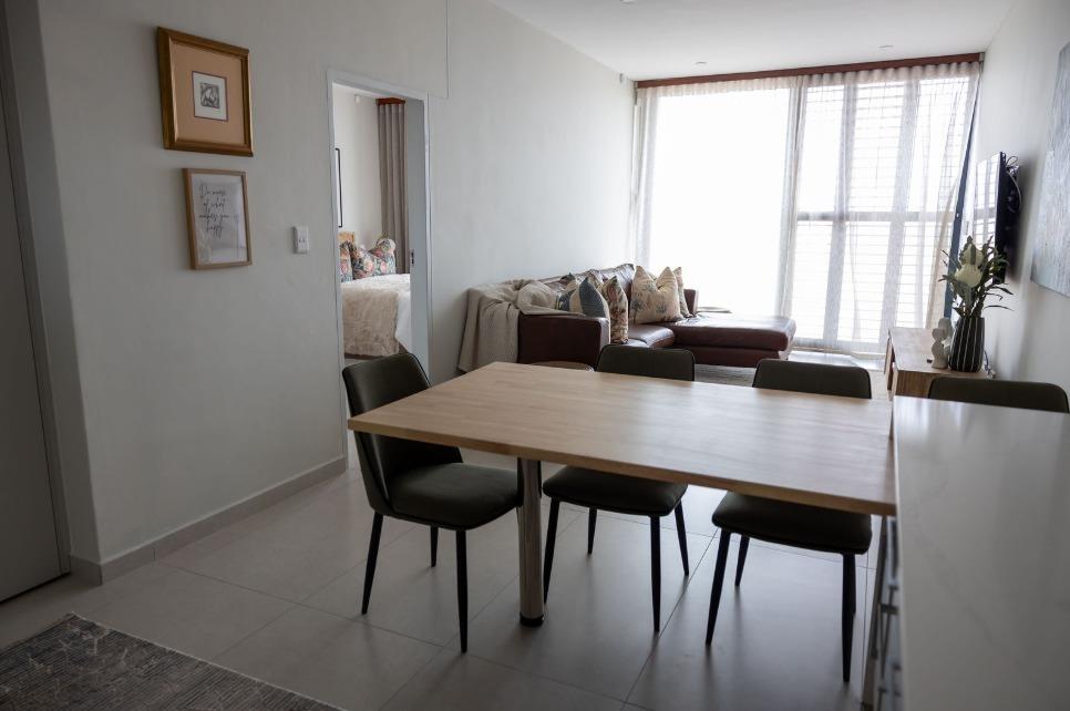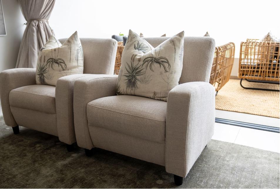 The main living level boasts a stylish open-plan kitchen, dining area and lounge, fully furnished with high-quality appliances, smart interior features, leather couches, elegant curtains, original artwork and air-conditioning throughout. Large glass doors open seamlessly onto the patio, creating the perfect setting for sunset views and sundowners.