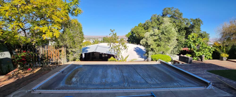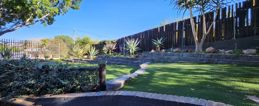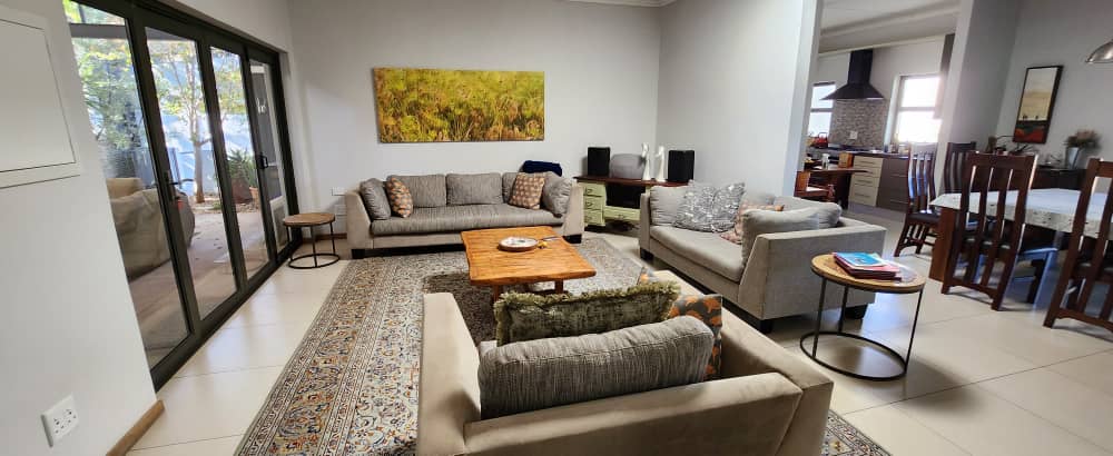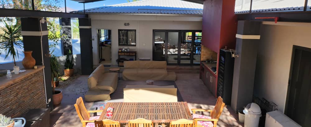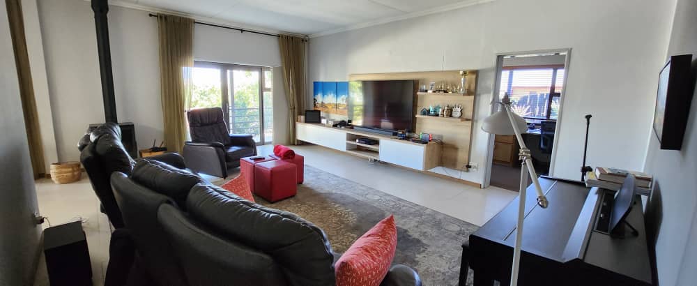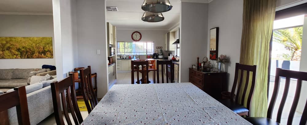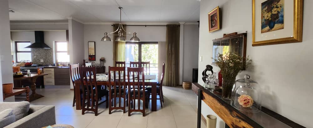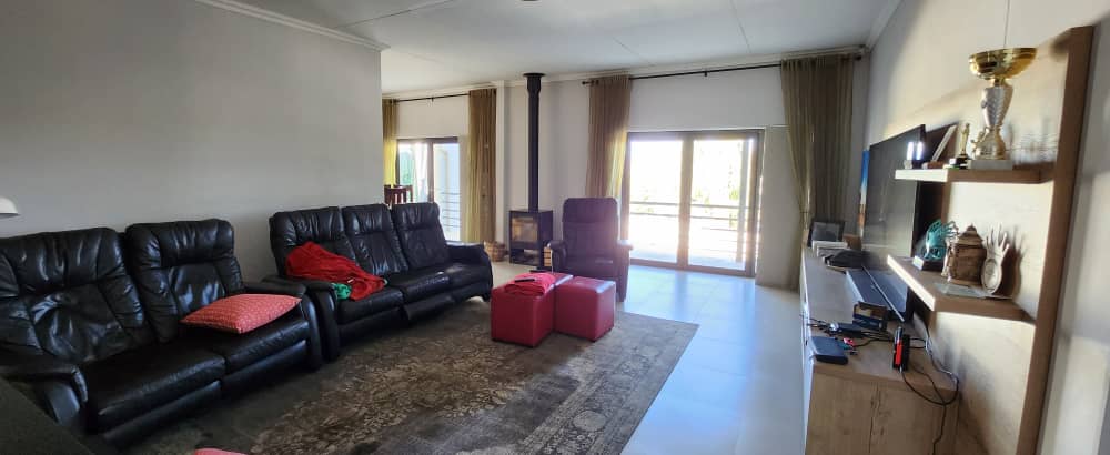 4 bedroom house with 3 bedrooms, kitchen with scullery and dining room. Living room, opening up on covered BBQ area, TV room and study. Pool with entertainment area. 2 bedroom flat with 2 bathrooms and kitchen with open plan living. 3 garages with extra parking and excellent security. the spacious erf also has an extra portion that can be developed